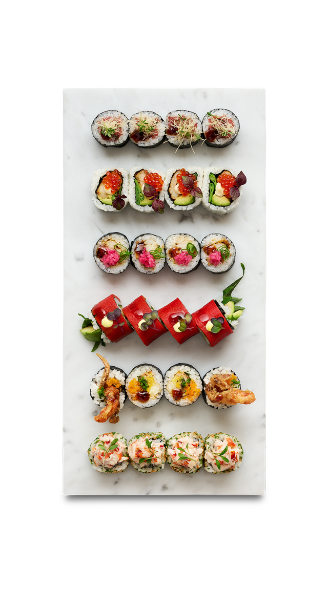 Red'N'Green maki with roasted pepper, avocado, cucumber, yuzu-kosho, shiso & tsume