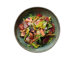 Grilled salmon, shrimp and seared tuna on a salad of green leaves, red cabbage, quinoa, tomatoes, edamame, avocado, radish, broccoli & sesame – topped with lotus chips & miso-mustard dressing